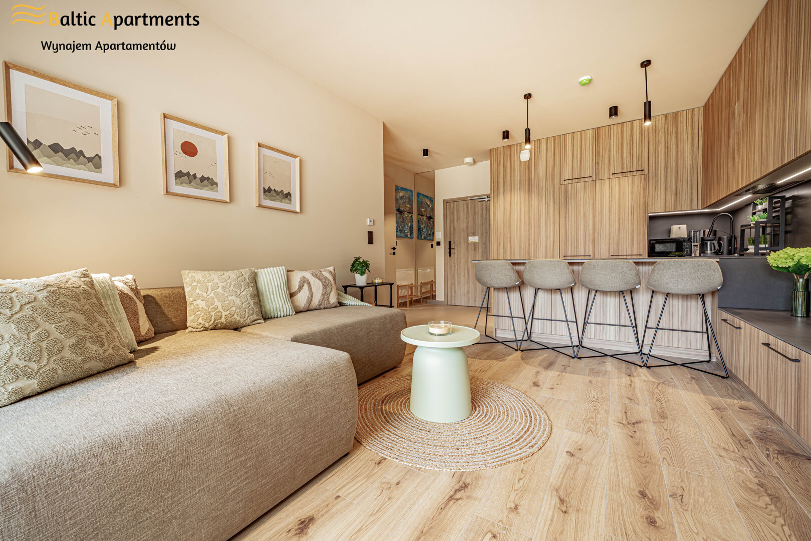 Wnętrze apartamentu zostało zaprojektowane w ciepłym, naturalnym stylu z wykorzystaniem drewna, jasnych barw i dużych przeszkleń, dzięki czemu przestrzeń jest jasna i sprzyja relaksowi.