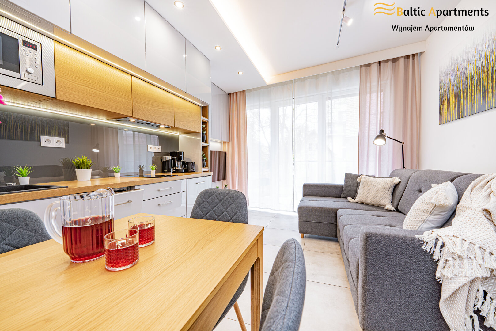 Apartament typu suit Lissa 16 ze słonecznym balkon usytuowany jest na pierwszym piętrze, ma możliwość zakwaterowania do 4 osób. Stylowo zaprojekowana przestrzeń apartamentu oferuje przestronny salon z wypełni wyposażonym aneksem kuchennym, sypialnię z komfortowym łóżkiem oraz piękną łazienkę z prysznicem oraz pralką. Apartament wyróżnia się ciepłym, nowoczesnym wystrojem oraz funkcjonalnością. Część dzienna wyposażona w wygodną rozkładaną sofę, stolik z czterema krzesłami, z wyjściem na taras stanowi doskonałe miejsce odpoczynku i relaksu, dodatkowo w pełni wyposażony, nowoczesny aneks kuchenny umożliwia przyrządzenie posiłków, które można spożywać przy stole. Przestrzeń sypialni wypełnia wygodne łóżko oraz pojemna szafa. Nowoczesne oraz ciepłe wnętrza, a także funkcjonalnie zaprojektowana przestrzeń zapewniają mieszkaniu elegancki, a zarazem przytulny klimat. Budynek posiada windę oraz odpłatne miejsca postojowe w garażu.