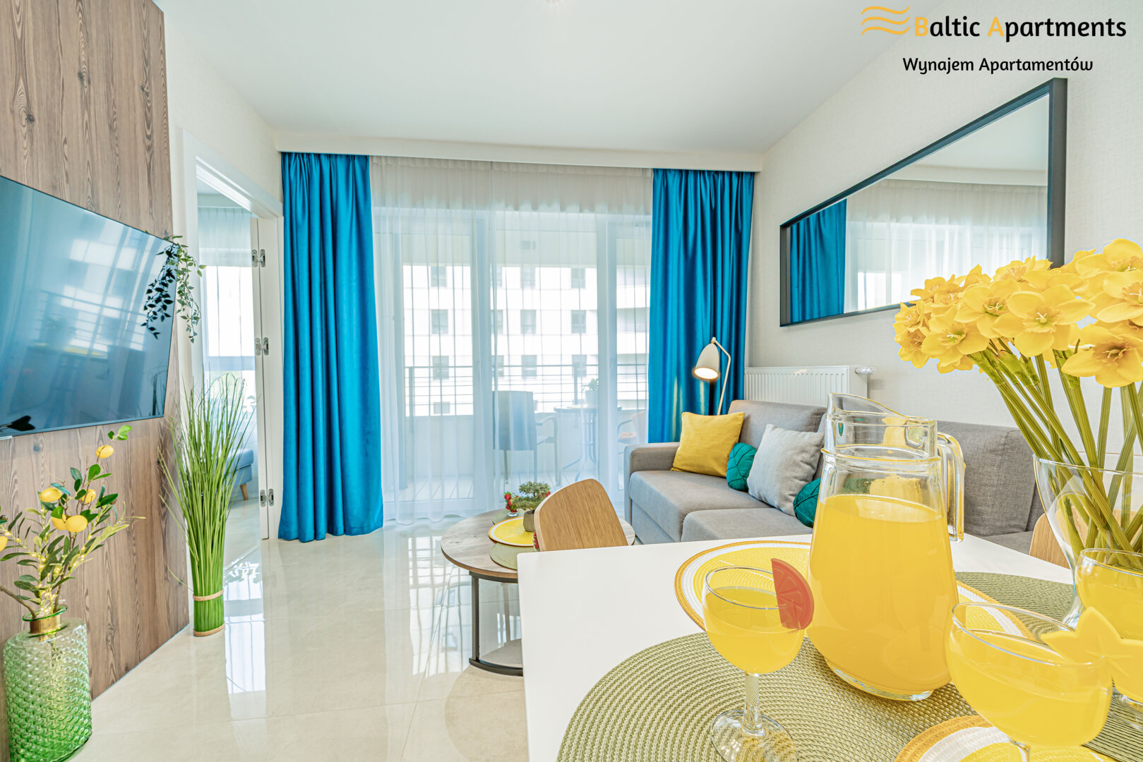 One-bedroom apartment with balcony "Sun Towers 39/72" is situated on the fifth floor and can accommodate up to 4 people. Elegantly designed space of the apartment, bold colors offers a bedroom with a comfortable double bed, a living room with a fully equipped kitchenette, exit to the balcony and a bathroom with a shower. The apartment is distinguished by a modern design and functionality full of modern architecture. The living area is equipped with a comfortable double sofa bed, a table with 4 chairs, and a fully equipped, stylish kitchenette allows you to prepare meals that can be eaten at the table. The aesthetic, modern colors of the interior as well as the functionally designed space provide the apartment with an elegant and cozy atmosphere. The building has elevators.